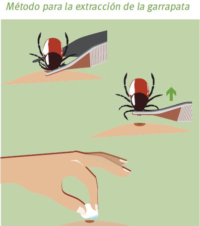 Dado que se hacen recomendaciones muy diferentes y a veces contradictorias sobre la eliminación de garrapatas, vale la pena echar un vistazo al Ministerio de Sanidad. Allí, la eliminación de la garrapata se ilustra con las siguientes imágenes (Recomendaciones para prevenir enfermedades por picadura de garrapatas):