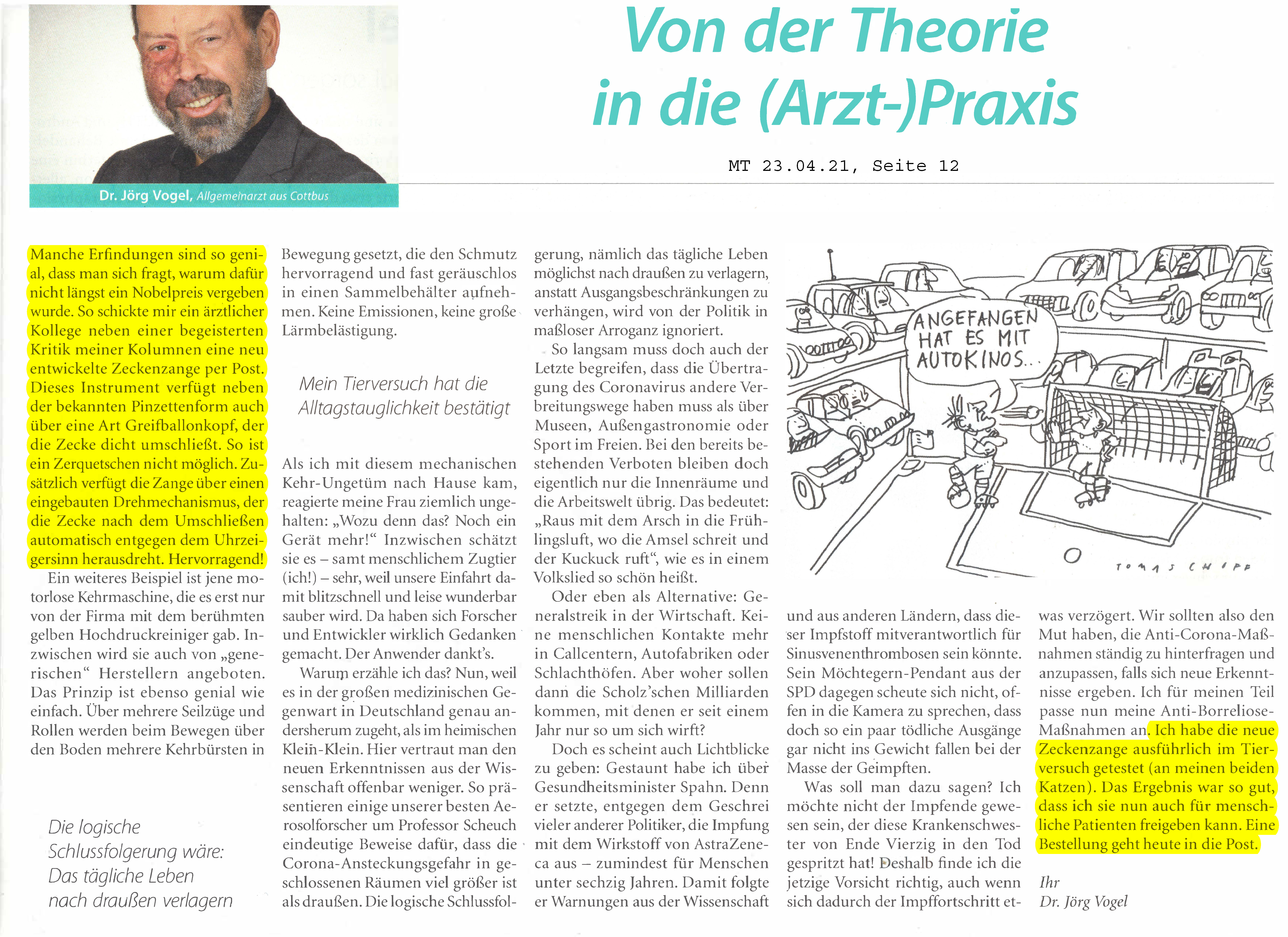 Manche Erfindungen sind so genial, dass man sich fragt, warum dafür nicht längst ein Nobelpreis vergeben wurde. So schickte mir ein ärztlicher Kollege neben einer begeisterten Kritik meiner Kolumnen eine neu entwickelte Zeckenzange per Post. Dieses Instrument verfügt neben der bekannten Pinzettenform auch über eine Art Greifballonkopf, der die Zecke dicht umschließt. So ist ein Zerquetschen nicht möglich. Zusätzlich verfügt die Zange über einen eingebauten Drehmechanismus, der die Zecke nach dem Umschließen automatisch entgegen dem Uhrzeigersinn herausdreht. Hervorragend!