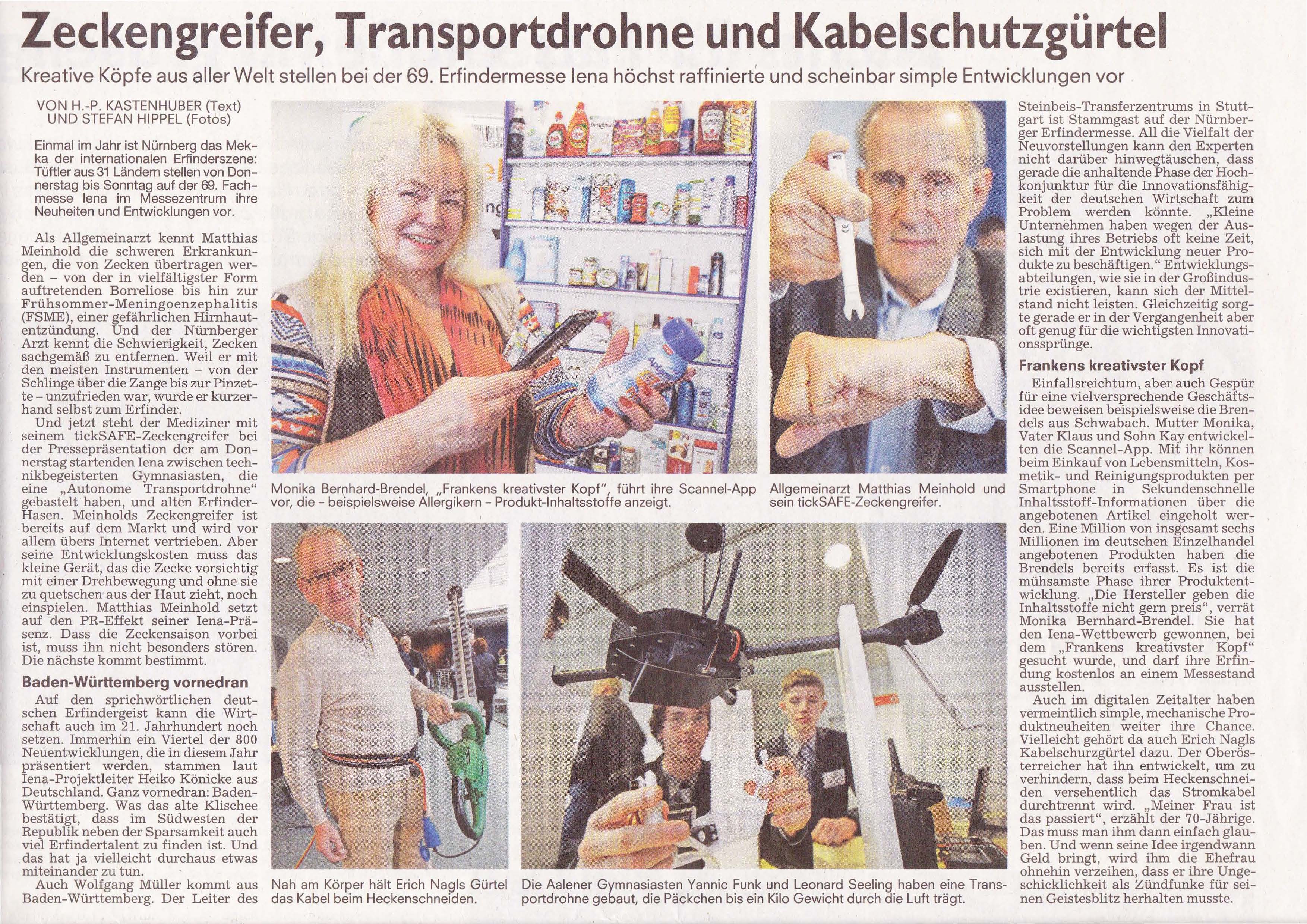 Einmal im Jahr ist Nürnberg das Mekka der internationalen Erfinderszene: Tüftler aus 31 Ländern stellen von Donnerstag bis Sonntag auf der 69. Fachmesse iENA im Messezentrum ihre Neuheiten und Entwicklungen vor. Als Allgemeinarzt kennt Matthias Meinhold die schweren Erkrankungen, die von Zecken übertragen werden - von der in vielfältigster Form auftretenden Borreliose bis hin zur Frühsommer-Meningoenzephalitis (FSME), einer gefährlichen Hirnhautentzündung. Und der Nürnberger Arzt kennt die Schwierigkeit, Zecken sachgemäß zu entfernen. Weil er mit den meisten Instrumenten - von der Schlinge über die Zange bis zur Pinzette - unzufrieden war, wurde er kurzerhand selbst zum Erfinder. Und jetzt steht der Mediziner mit seinem tickSAFE-Zeckengreifer bei der Pressepräsentation der am Donnerstag startenden Iena zwischen technikbegeisterten Gymnasiasten, die eine „Autonome Transportdrohne" gebastelt haben, und alten Erfinder-Hasen. Meinholds Zeckengreifer ist bereits auf dem Markt und wird vor allem übers Internet vertrieben. Aber seine Entwicklungskosten muss das kleine Gerät, das die Zecke vorsichtig mit einer Drehbewegung und ohne sie zu quetschen aus der Haut zieht, noch einspielen. Matthias Meinhold setzt auf den PR-Effekt seiner iENA-Präsenz. Dass die Zeckensaison vorbei ist, muss ihn nicht besonders stören. Die nächste kommt bestimmt.